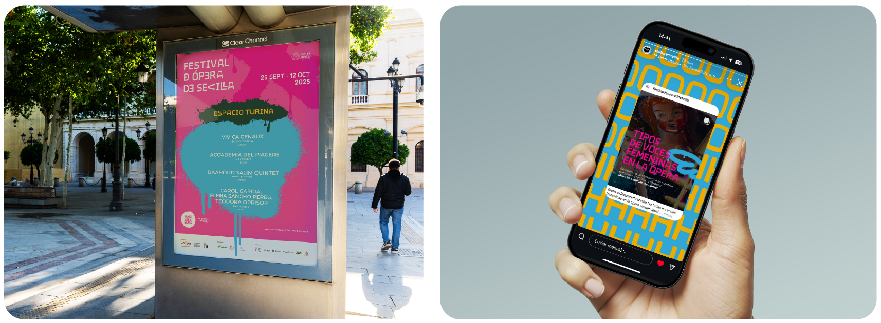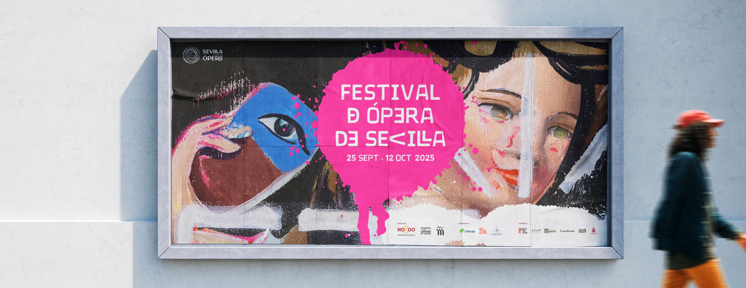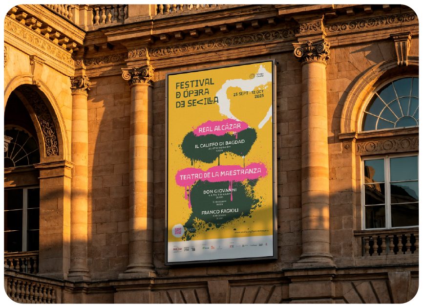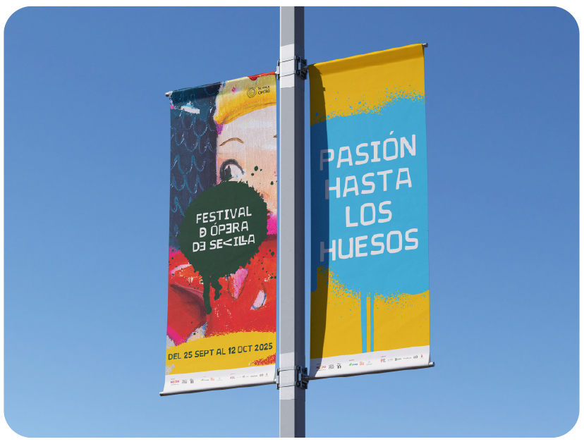 Cada pieza refuerza la misma emoción y reconocimiento visual. El resultado es una identidad sólida, atrevida y memorable, al servicio de una campaña que convierte Sevilla en un ecosistema lírico contemporáneo. Un proyecto que demuestra que cuando una identidad brota de lo auténtico —una obra
